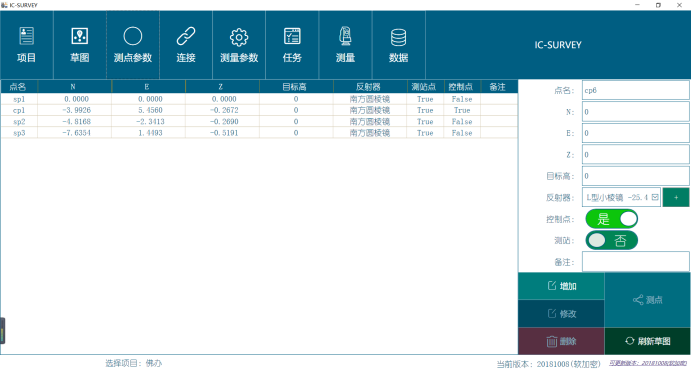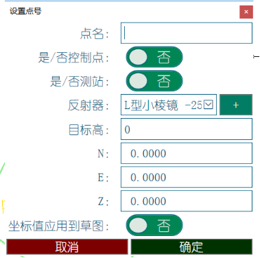 特别说明:是/否测站,指的是,此目标点号处,是否将要架设测站,如果设置不正确,那么会导致在任务启动的时候,不能选择此点作为测站架设;坐标值应用到草图,指的是,当导线仅仅为设计阶段,坐标值是未知的时候,勾选“否”,那么即使各个点的坐标值为0,在草图上,都能反映设计时的平面关系。