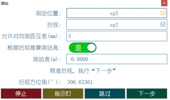 6. 跳过,是指,在某些情况下,软件意外退出,但是后视已经定向完毕的情况下,避免重新操作,可以跳过;在自定义的导线测量中,如果没有已知的后视坐标,并且仪器已经随意设置了方向的情况下,可以选择跳过,在后面的步骤中,另外测量控制点。